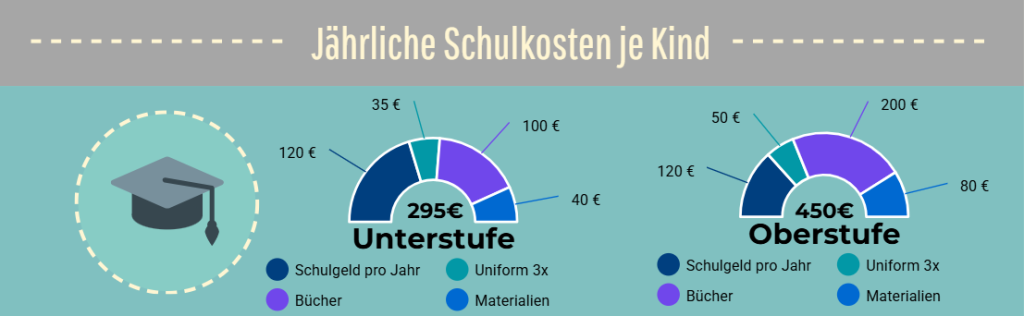 In der folgenden Grafik seht ihr wie sich die Kosten (in etwa) für ein Schuljahr nach Unter- und Oberstufe aufteilen. Der Kostenblock für Bücher, Materialien und Uniform übersteigt die Schulgebühren deutlich.